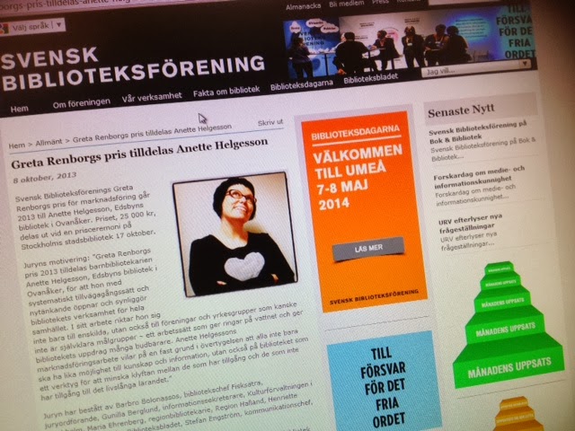 Jag är så stolt, glad och rörd över att blivit tilldelad utmärkelsen Greta Renborgs pris av Svensk biblioteksförening!
