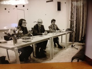 Greta var flera gånger på Edsbyns bibliotek när hon arbetade tillsammans med, bland annat tidigare bibliotekschefen Mona, i Gävleborgsprojektet. Förmodligen är detta foto taget under denna tid. Draperierna är desamma i hörsalen idag. Nästan så att de börjar bli moderna igen 🙂
